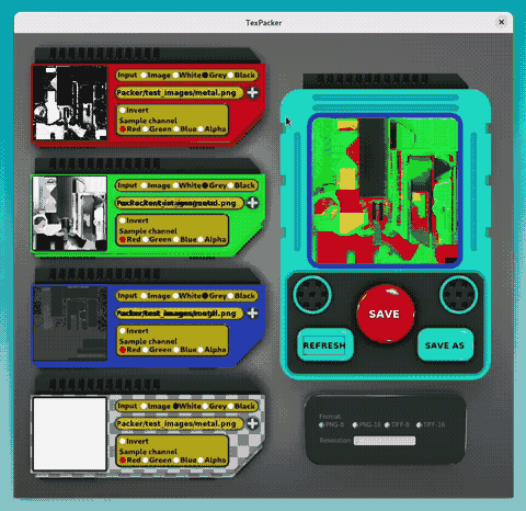 TexPacker is a program to help 3D artists pack up to four greyscale texture maps into a single image file.
